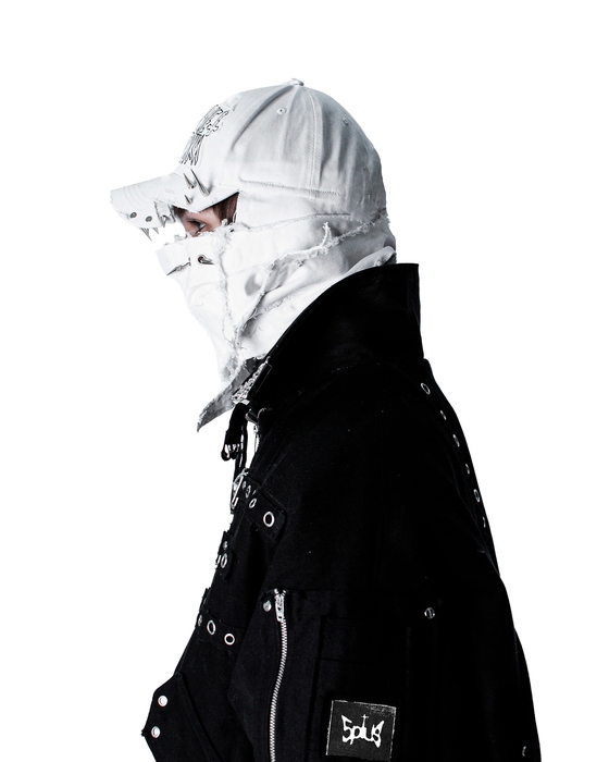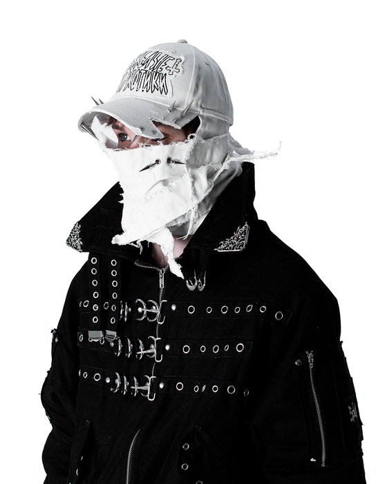ручной дистресс, нашивка с печатью, шипы сверху и снизу козырька.
